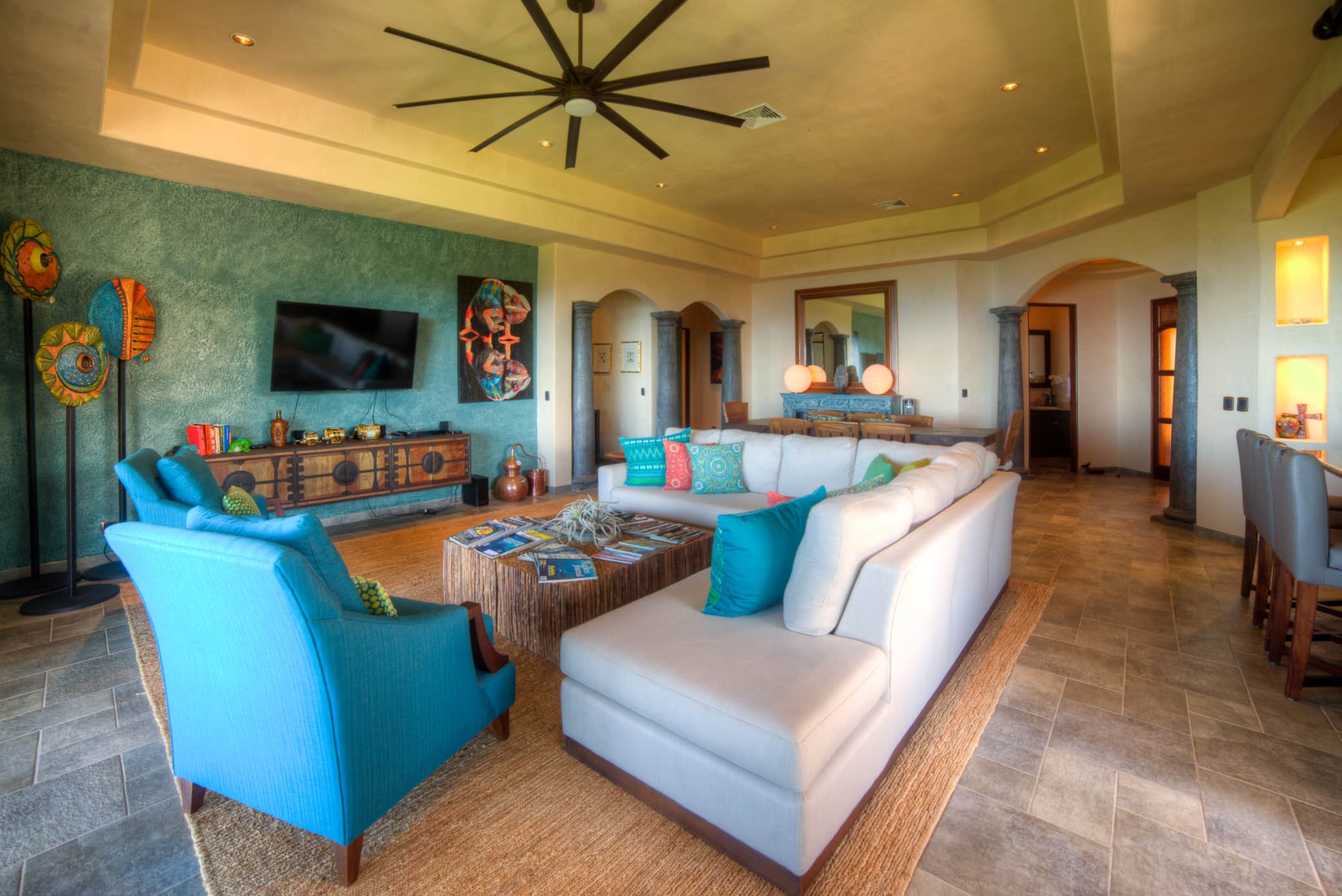 Known for its exceptional furnishings and décor, the condo’s single-level layout flows effortlessly from a state-of-the-art chef's kitchen to a generous living and dining area made for entertaining. Sliding glass doors open to an oversized covered patio where three distinct sitting areas and a large outdoor dining table create an ideal space for sunrise coffees, sunset dinners, and everything in between.